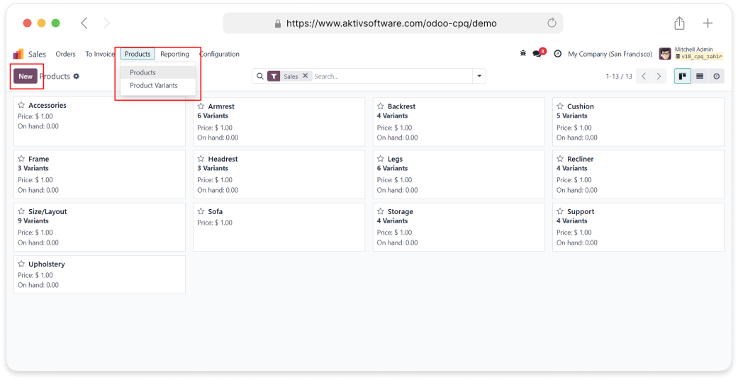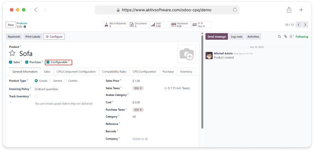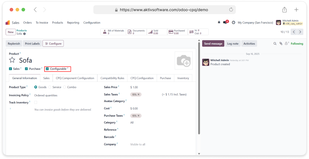 • In the Sales module, you must select the “Configurable” option to create a configurable