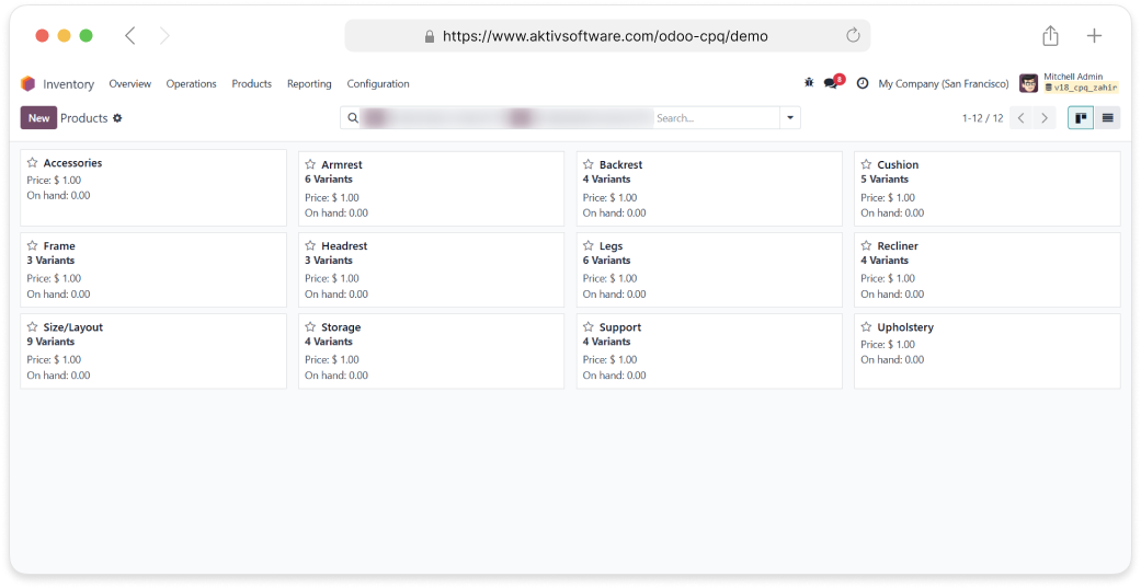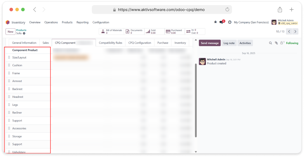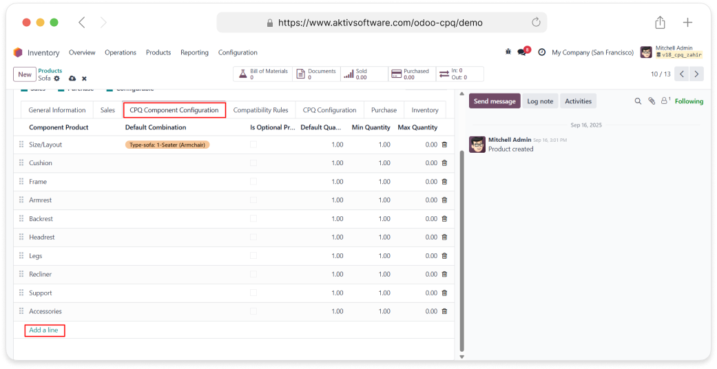 Odoo CPQ lets you build and sell configurable products by breaking them down into components, where some are mandatory and others are optional, each with multiple selectable options. It simplifies the process of configuring complex products, automatically calculates prices based on selections, enforces compatibility rules to avoid errors, and seamlessly links the configuration with manufacturing through Bills of Materials (BoM).