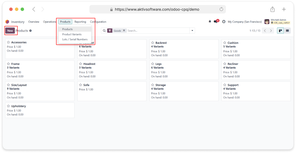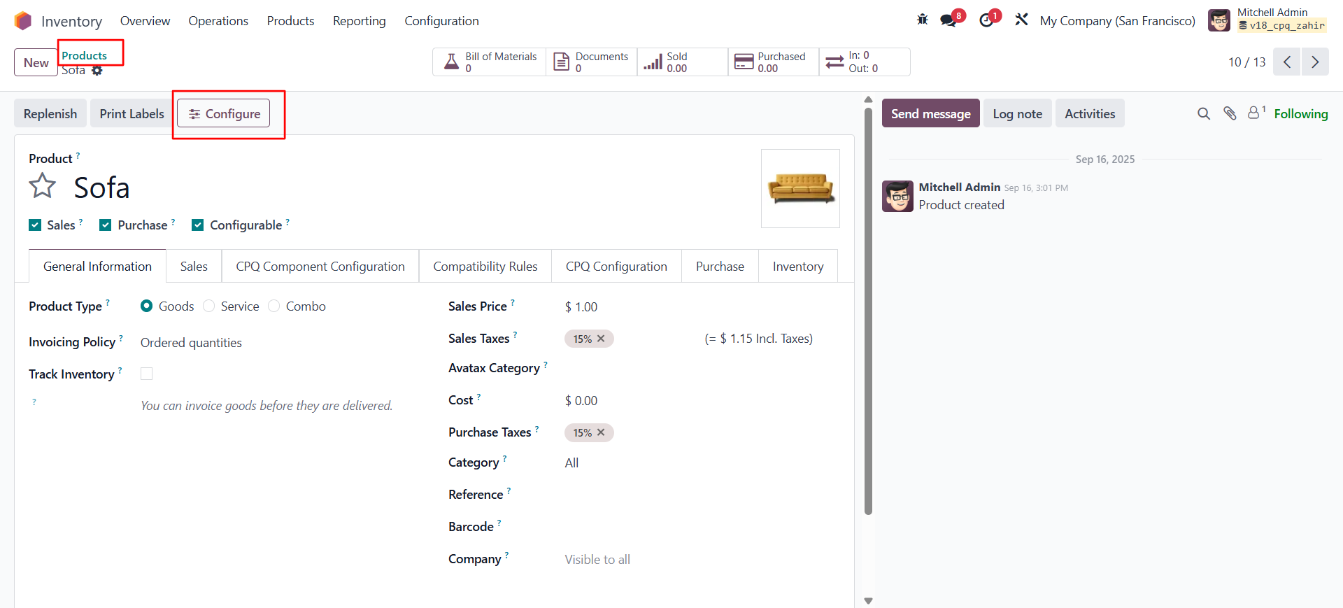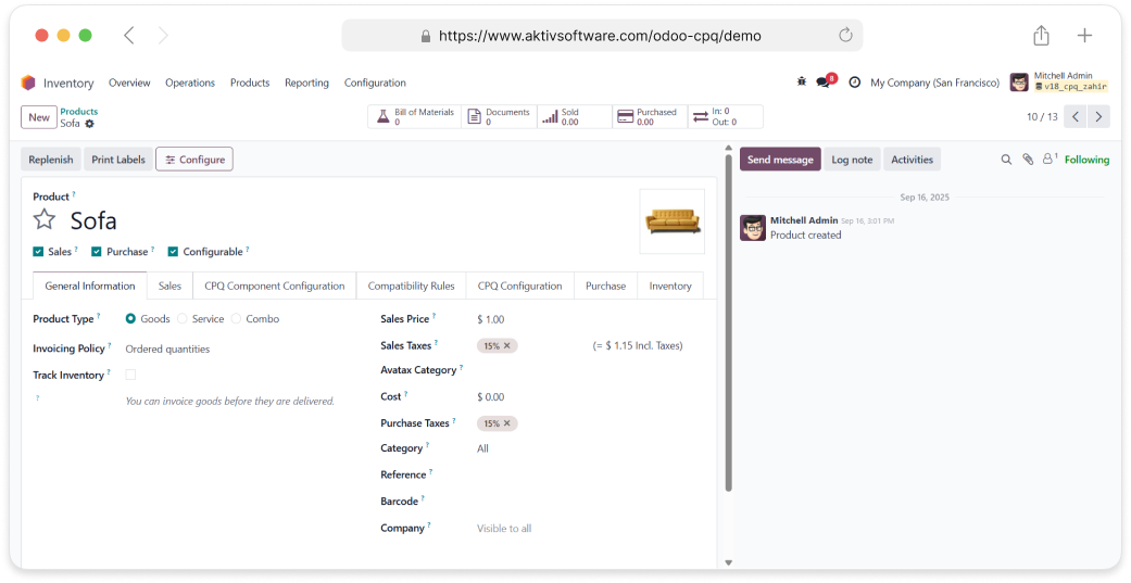 • In the Inventory module, you must select the “Configurable” option to create a configurable
