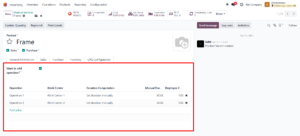 Each operation can represent a specific manufacturing step (e.g., Cutting, Stitching, Polishing). These operations can later be used in the Configurable product’s Bill of Materials (BoM) or Manufacturing Order (MO), allowing the system to dynamically adapt production workflows based on the configuration selected in CPQ.