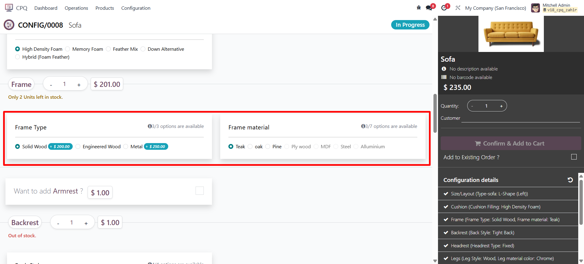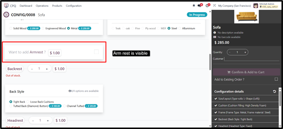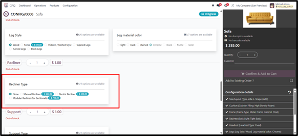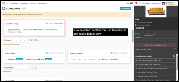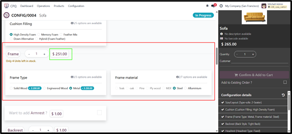 For example, when a certain frame type is selected, specific optional components such as “Armrest” or “Recliner Mechanism” can be hidden or displayed accordingly.