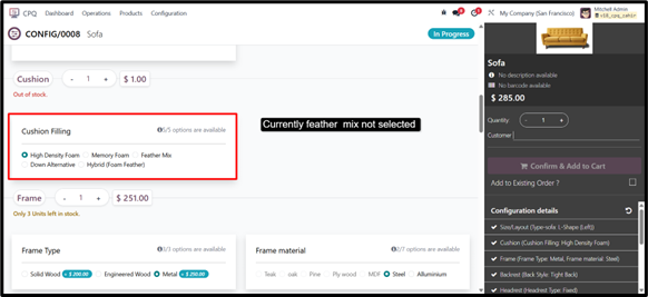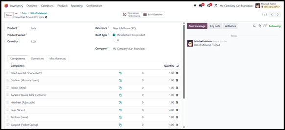 When you configure a Configurable product, add a customer, confirm the configuration, and add it to the cart, the system generates a quotation. Based on this quotation, the corresponding Bill of Materials (BoM) is automatically created.