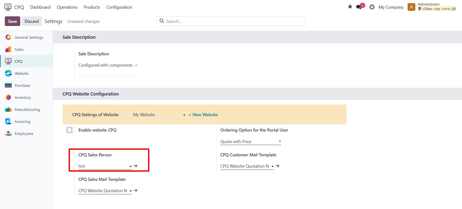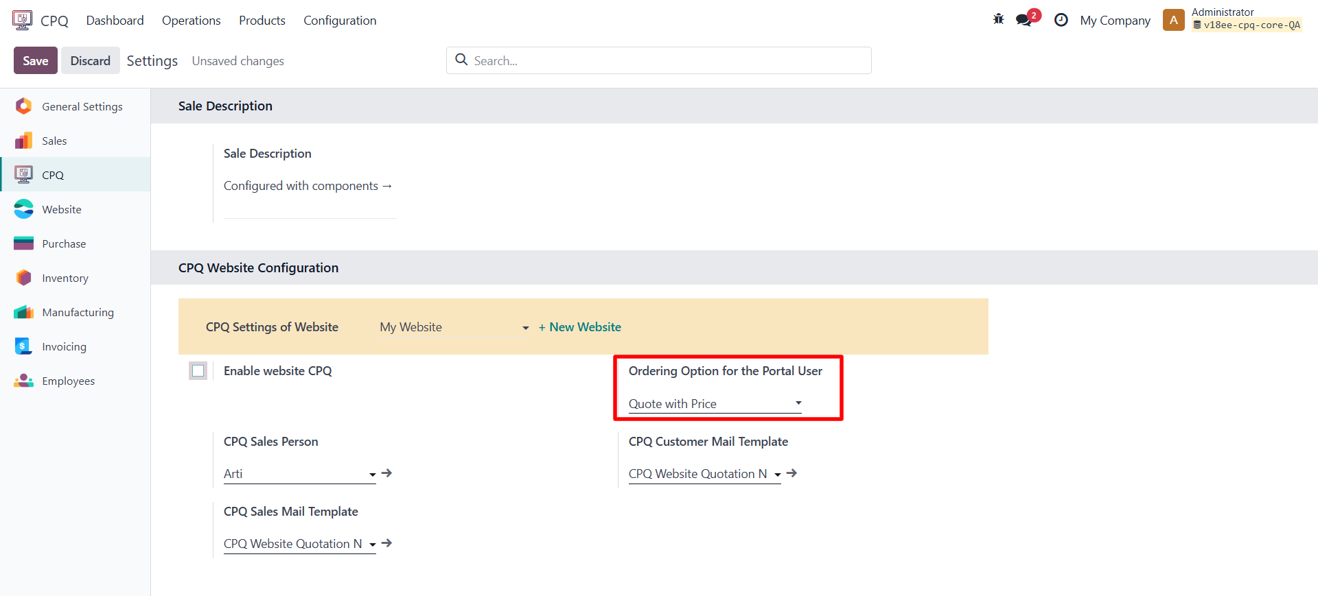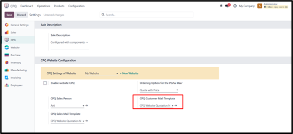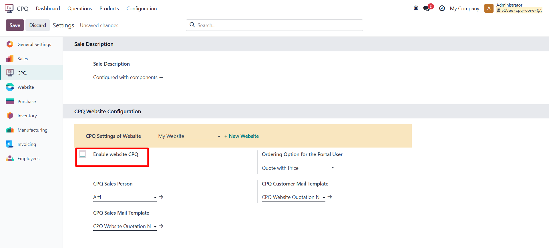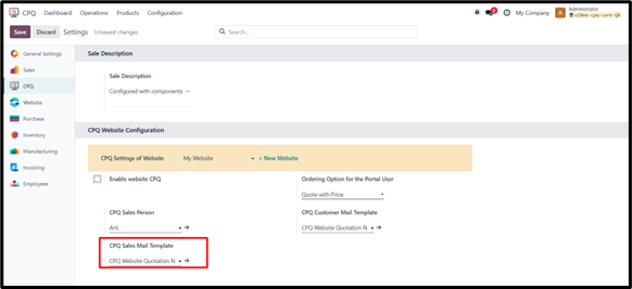 • Go to CPQ → Configuration → Settings and enable the option “Enable Website CPQ” in the CPQ Website Configuration tab.