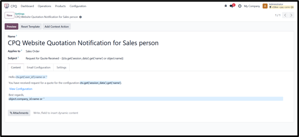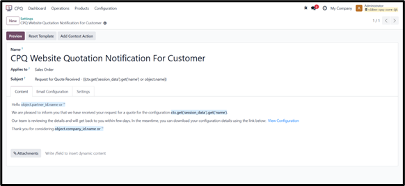 • Sales Mail Template: sent to the salesperson when a new configuration or RFQ is created.